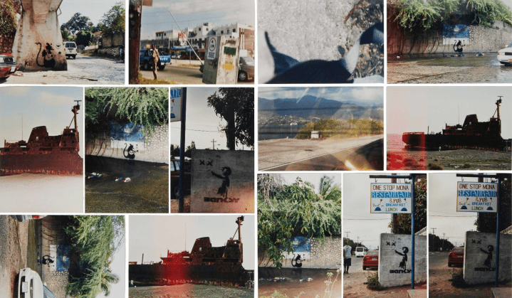 In early 2004, a group from Team Banksy went to the Caribbean together with DJ Jon Carter and filmmaker Rick Elgood. One of their hosts during the visit was Jamaican dancehall star Mark Anthony Myrie, a.k.a. Buju Banton. There is very little documented from the trip to Jamaica and even less from Cuba. The following collage with pictures of some of the work in Jamaica surfaced years later, when Steven Lazarides put part of his personal collection up for sale at Juliens in LA: