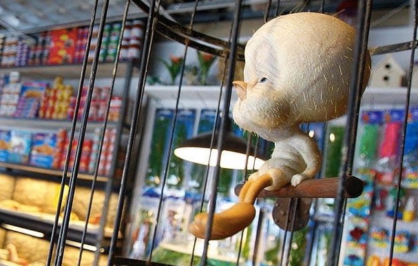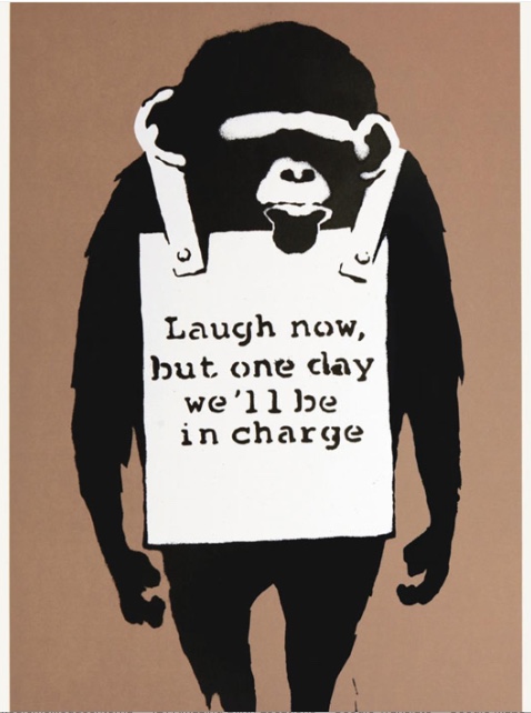 I might have missed some categories. Anyway, rarely have we seen an artist with so much interest in the animal kingdom. Rats, birds, monkeys, a few snakes and dogs, but only two cats, and plenty of animatronics—there are hundreds of animals in the Banksy catalogue. Other even more surprising elements are the ancient sculptures, the gasmasks, and the gold fish bowls. Let’s illustrate with a few images from each category: