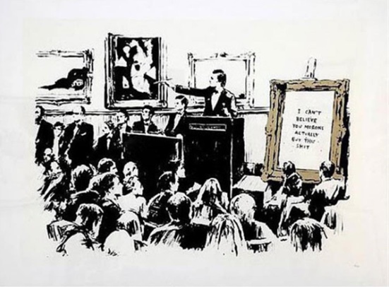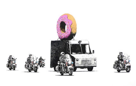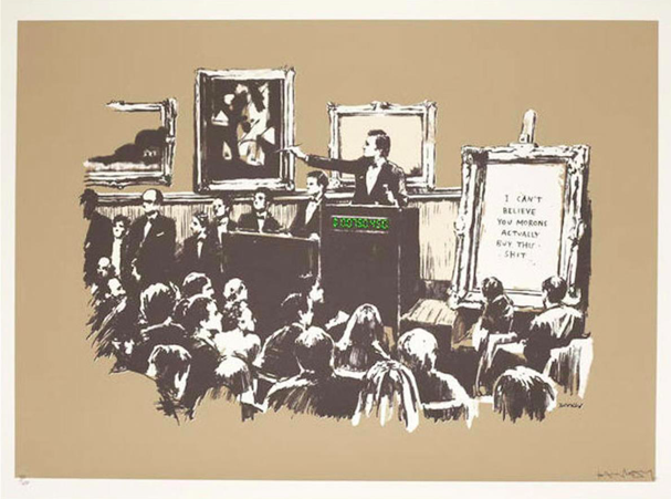 Several other motives have been released in slightly different versions. Examples are the prints released at the Barely Legal exhibition in 2006. These earlier versions of Morons, Applause, Trolleys and Grannies go under “LA Editions”. The year after, there were releases of the same prints in London but with some variations.