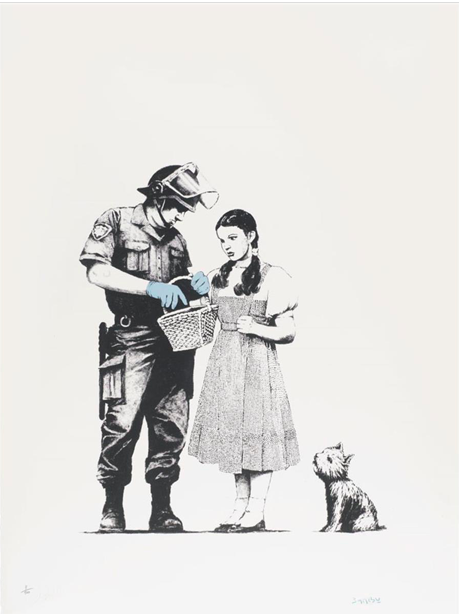Banksy’s handling office, Pest Control Office, has implemented a waterproof authentication system—every print comes with a Certificate of Authenticity (COA), for short. The limited supply and the authentication system have created a dynamic market where some of the most coveted prints sell for well over 50,000 GBP on the secondary market—pieces bought and sold between collectors at auctions, dealers, or galleries. At the time of its initial release in the early 2000s, Banksy might have sold the same print for 49 GBP.