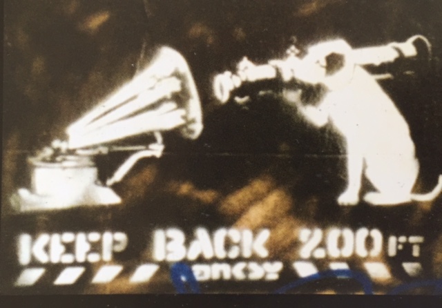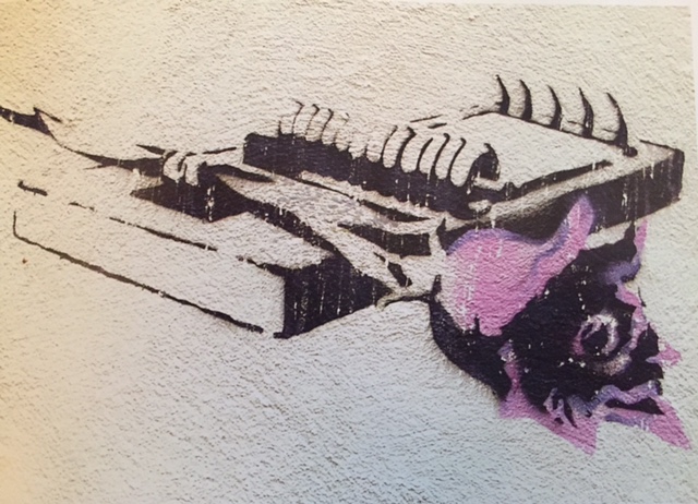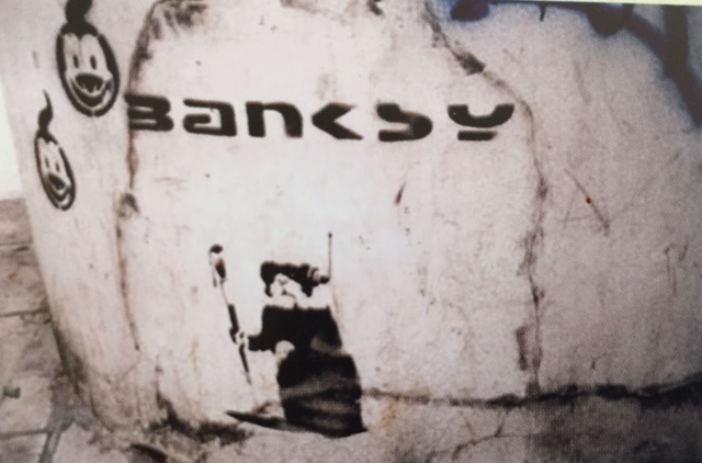 But outside the lobby there’s another early Banksy with more recognizable motifs: a fat cat politician smoking a cigar, a campaign poster of Elvis in Mickey Mouse ears, and a ballot box with a stick of dynamite wedged inside.