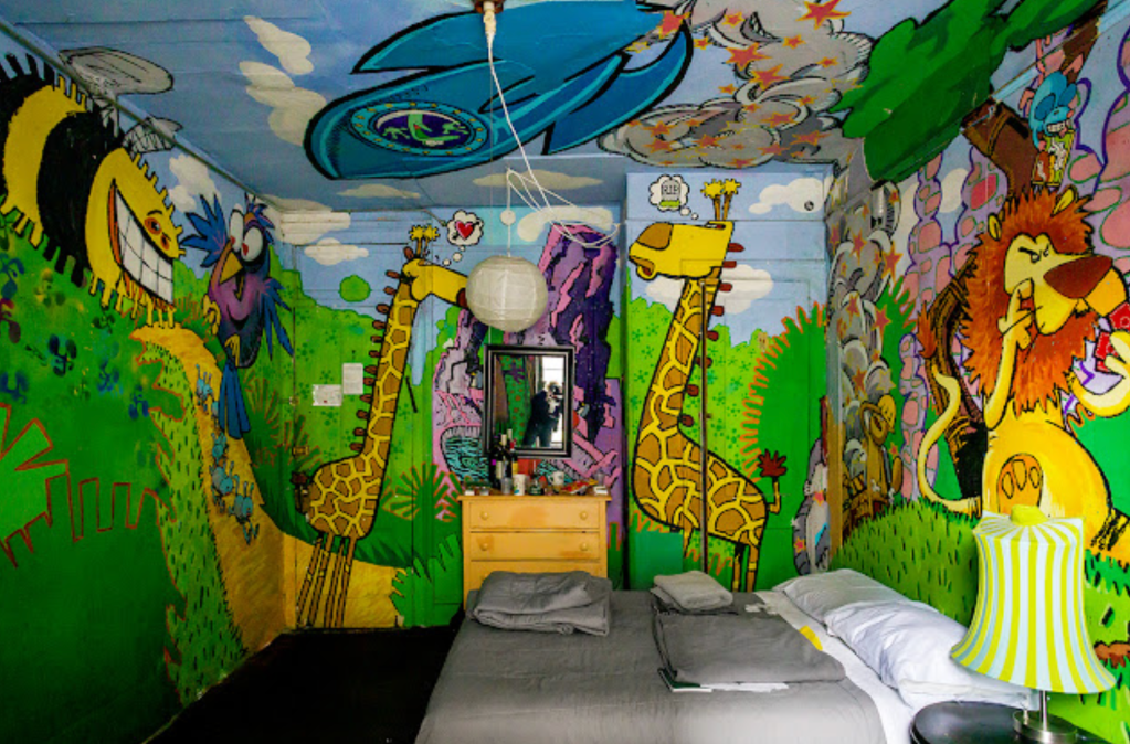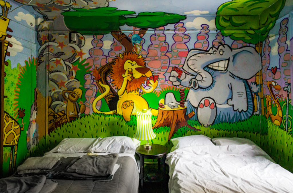 “The artists are mostly up-and-comers, but some went on to garner significant acclaim—none more so than Banksy, who decorated a stairwell and room 5B in 1999, years before he became the world’s most famous street artist. His colorful murals of cartoonish animals are a far cry from the satirical monochrome stenciling for which he later became known.