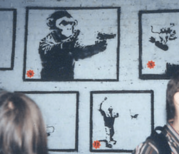 After moving to London in late 1999, Banksy returned to Bristol in February 2000 to open his first regular indoor exhibition at the restaurant Severnshed on The Grove, right behind the docks. Nowadays, the restaurant has changed its name to the Harbour House. The show was a mixture of stencils and acrylic on canvas. There were several remarkable pieces: Simple Intelligence Testing, Sharks, and You Told That Joke Twice.