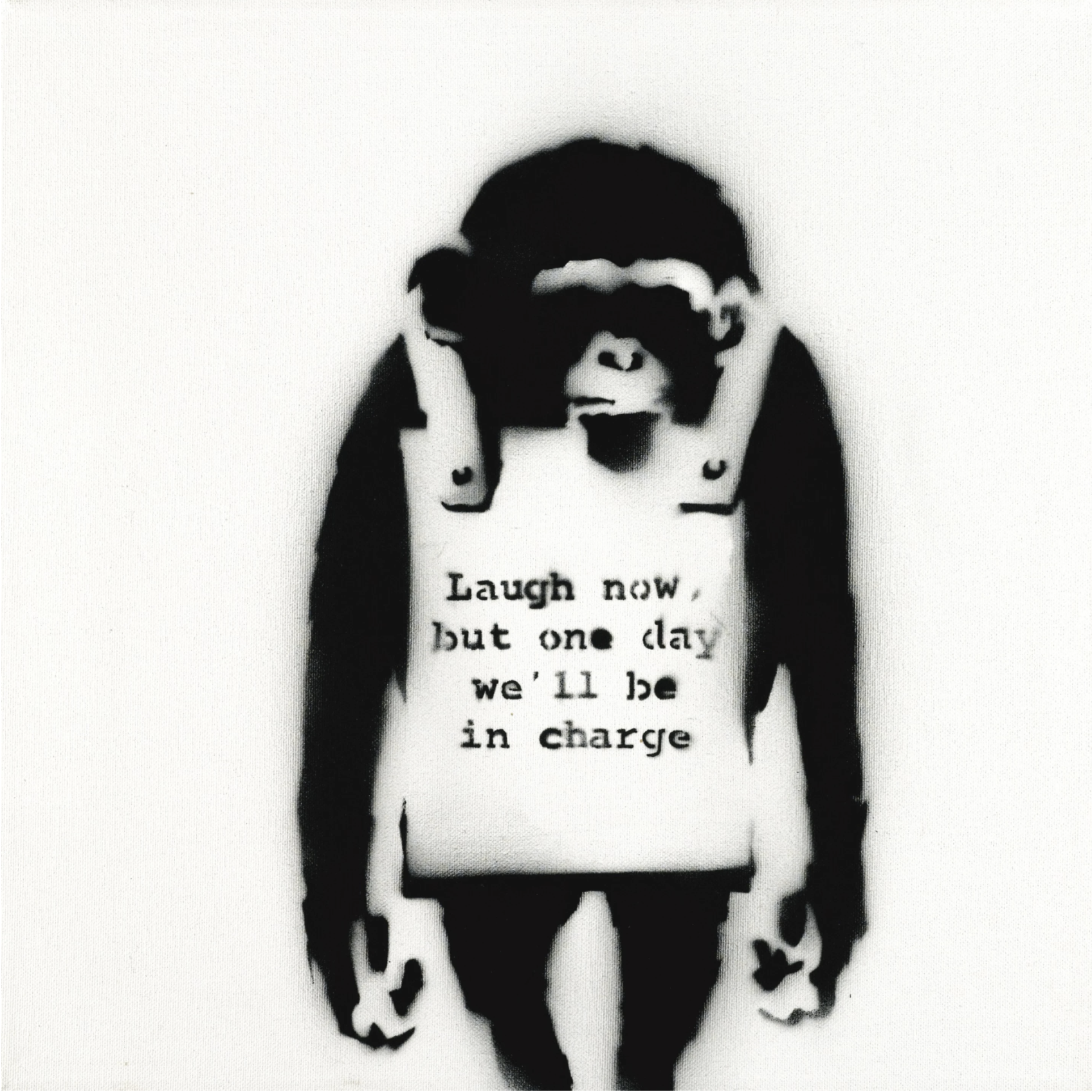 A month later, Banksy opened a reduced version of the Existencilism exhibition in Japan – Osaka (8-17 September) and Tokyo (13 – 24 September). Among other pieces, a Laugh Now on cardboard with the text in Japanese: