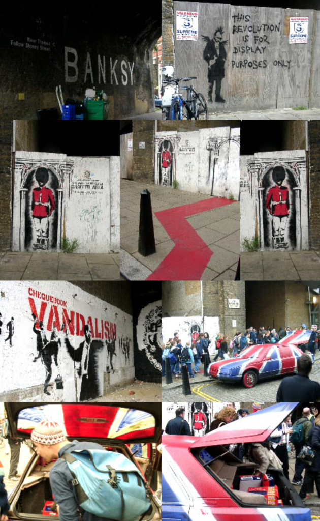 Banksy focused on London in 2002 and 2003, but he also did a few pieces in Bristol and Brighton. The iconic work Pulp Fiction went up in 2002 on Old Street in Shoreditch, one of Banksy’s preferred areas in London. The Royal Guards in different areas of London are from the same period.