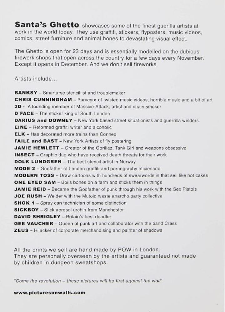 The 2004 Santa’s Ghetto was located in a run-down former porn shop on 121 Charing Cross Road, next to Foyles bookshop in Central London. The pop-up art exhibition opened daily from 10am to 8pm until Christmas Eve.
