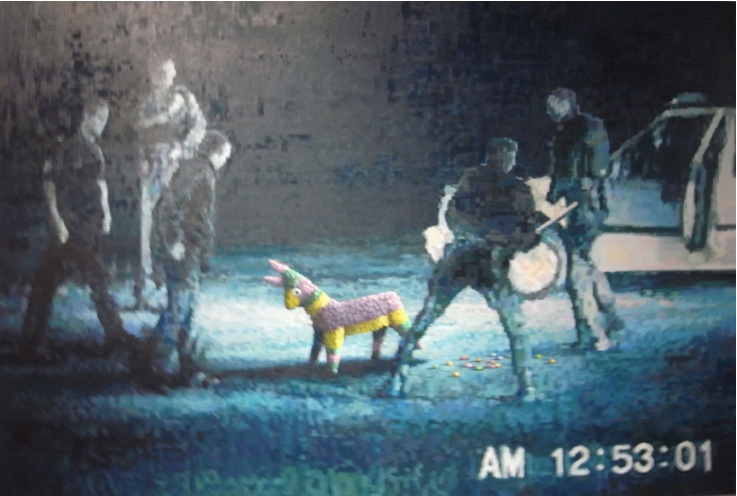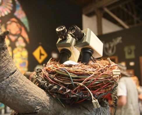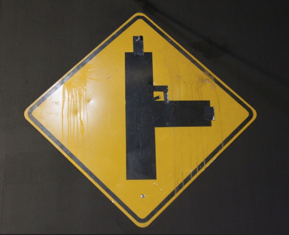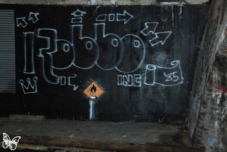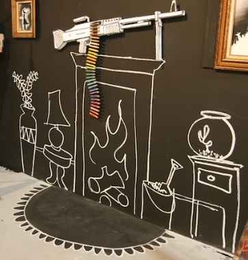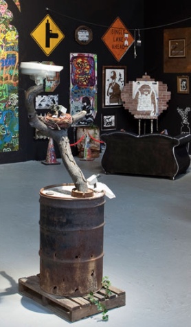 In a more illusionistic vein, Neckface has created a dark, filthy alleyway littered with broken bottles and debris whose only purpose seems to be inspiring trepidation. Such installations were obviously never intended for the street. Rather, they attempt to re-create a “street” atmosphere that is both carnival-esque and unsettling. In this, they are not unlike the works of mainstream installation artists — Mike Kelley comes to mind — or for that matter, the artificial environments at Disneyland.