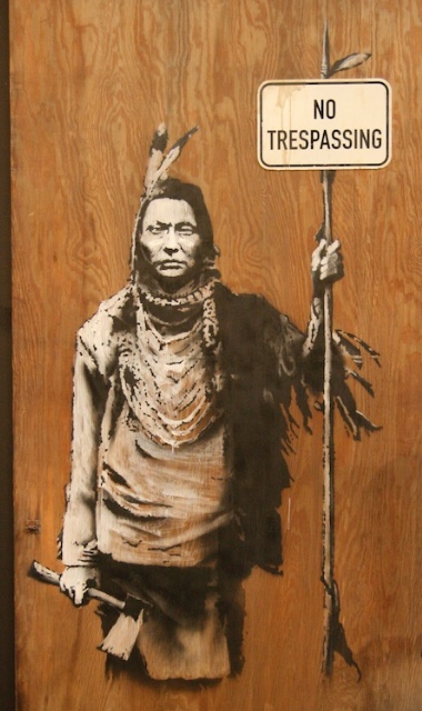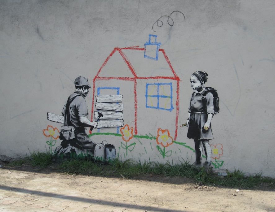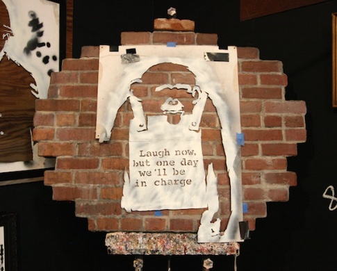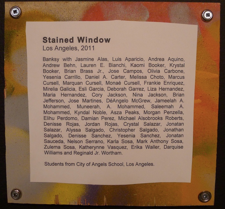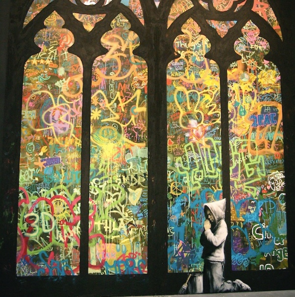 The Museum of Contemporary Art Los Angeles (MOCA), held a collective street art exhibition in April 2011. Banksy participated with versions of old work and some new stuff. Forgive us our trespassing—the graffiti boy praying—was a collaboration between Banksy and a local art school.