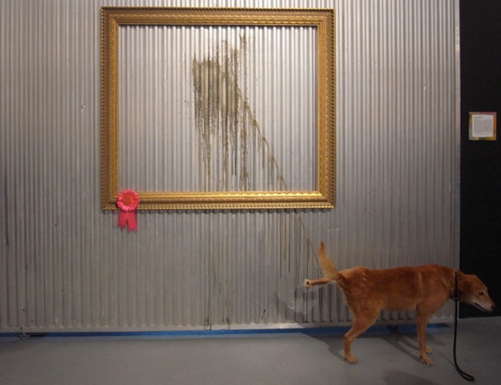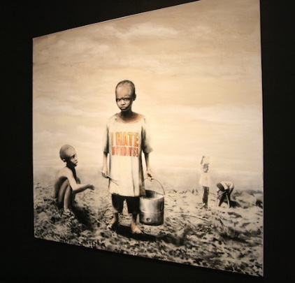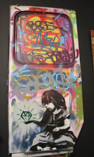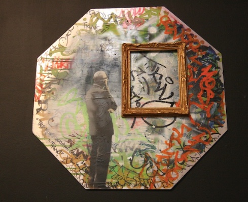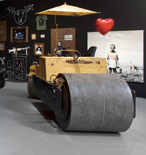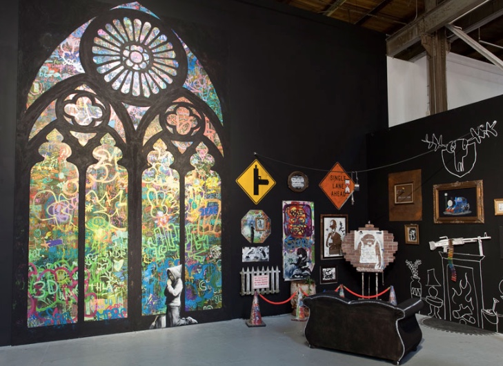 This elevation of street art in the museum — essentially, the show’s premise — is the target of the ubiquitous Banksy’s contribution. He asked local high school students to tag panels in myriad colors and then framed them inside a drawing of a Gothic arch that resembles a stained glass window in a church. Below, he added an illustration of a praying figure kneeling next to a can of paint. The piece suggests that enshrining graffiti art within the museum turns it into an icon requiring our submission. In case we missed this point, Banksy has also placed a real, full-sized steamroller in the space as a not-so-subtle reminder of the implacable march of commodification. Ever the contrarian, he brilliantly continues to bite the hand that feeds him.
