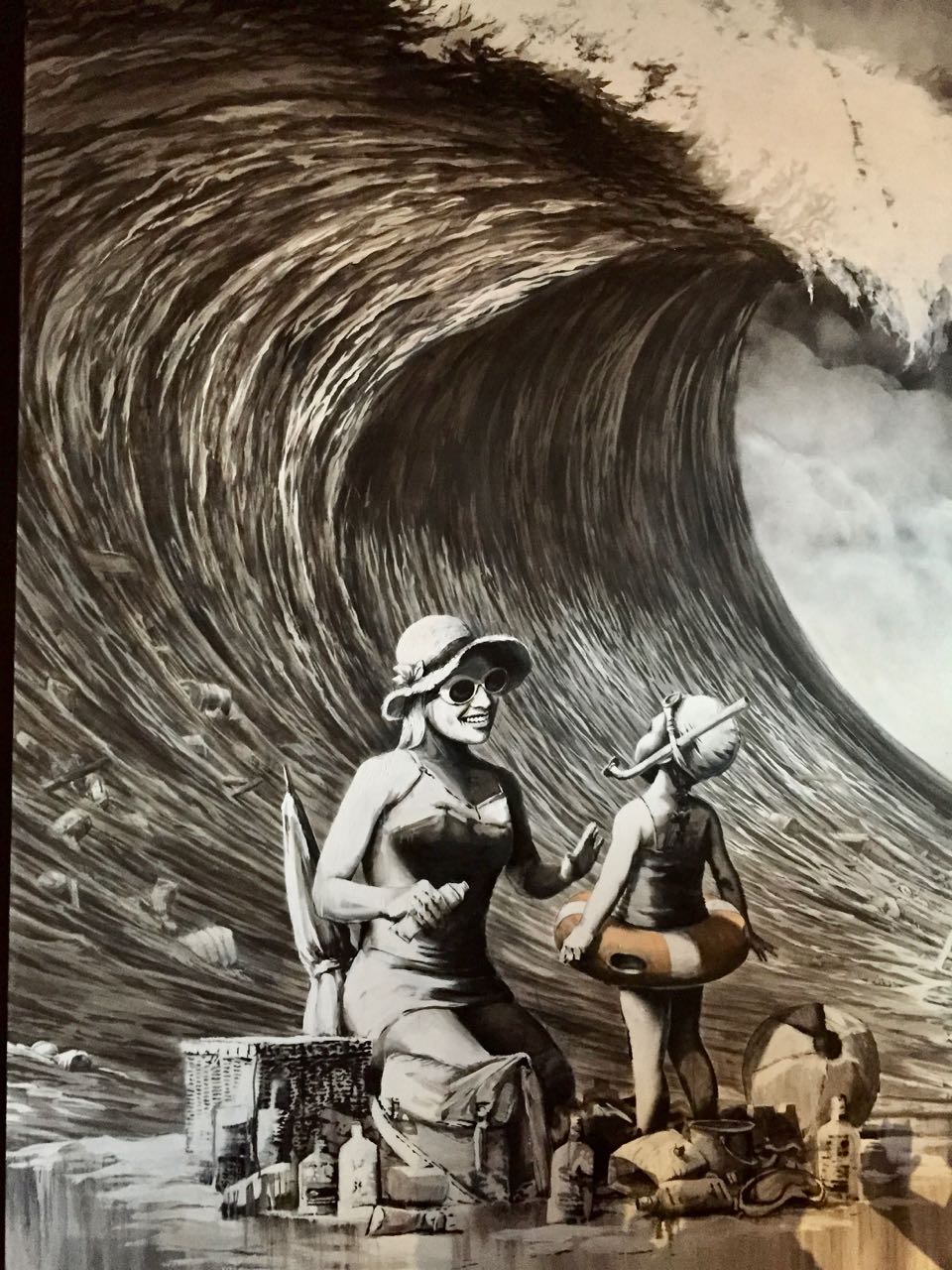 Banksy shows a painting of a mother and child about to be overwhelmed by a tsunami. The grotesquely clumsy crudeness of his painting technique up close, and without any excuse that he did it quickly to evade the cops, is embarrassing. But nastiest of all is the work’s peculiar lack of human feeling. We are – apparently – meant to think it’s funny that the wave is about to kill these beachgoers. They have lots of commodities, you see – sun cream and stuff. All the detritus of consumer capitalism. See the wave of the future crush them! This heartless allegory is worthy of Maoist propaganda. As art it is sterile and dead.