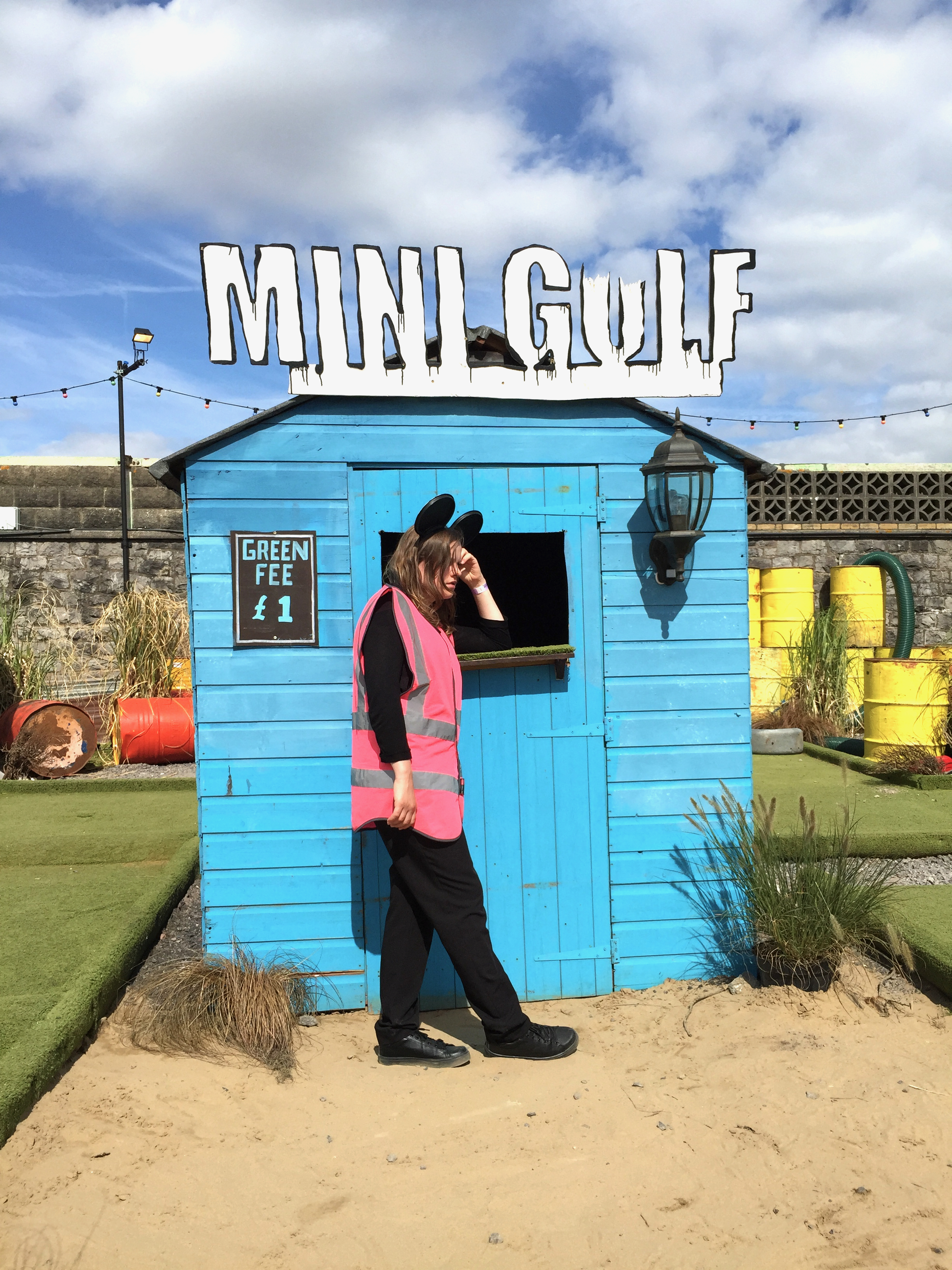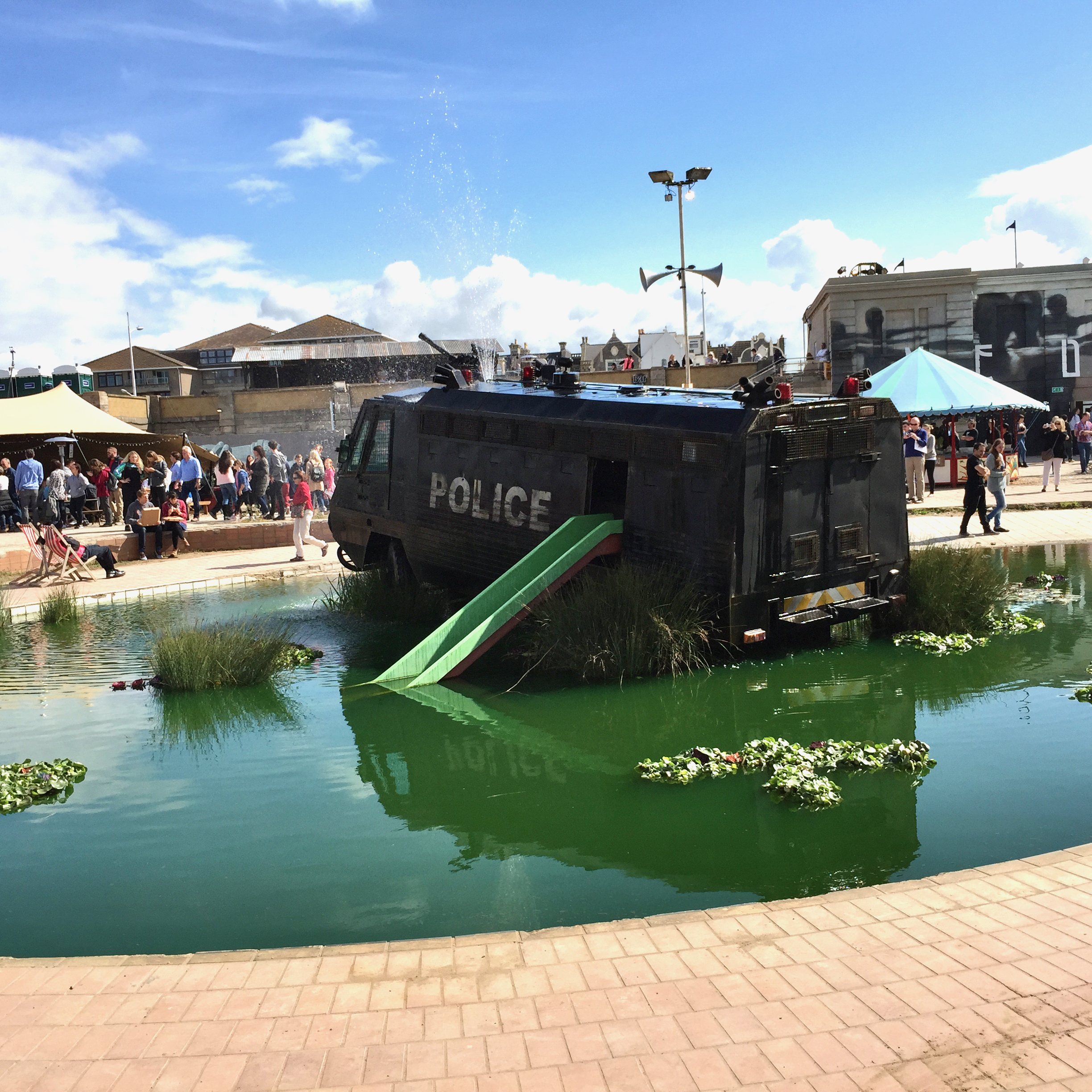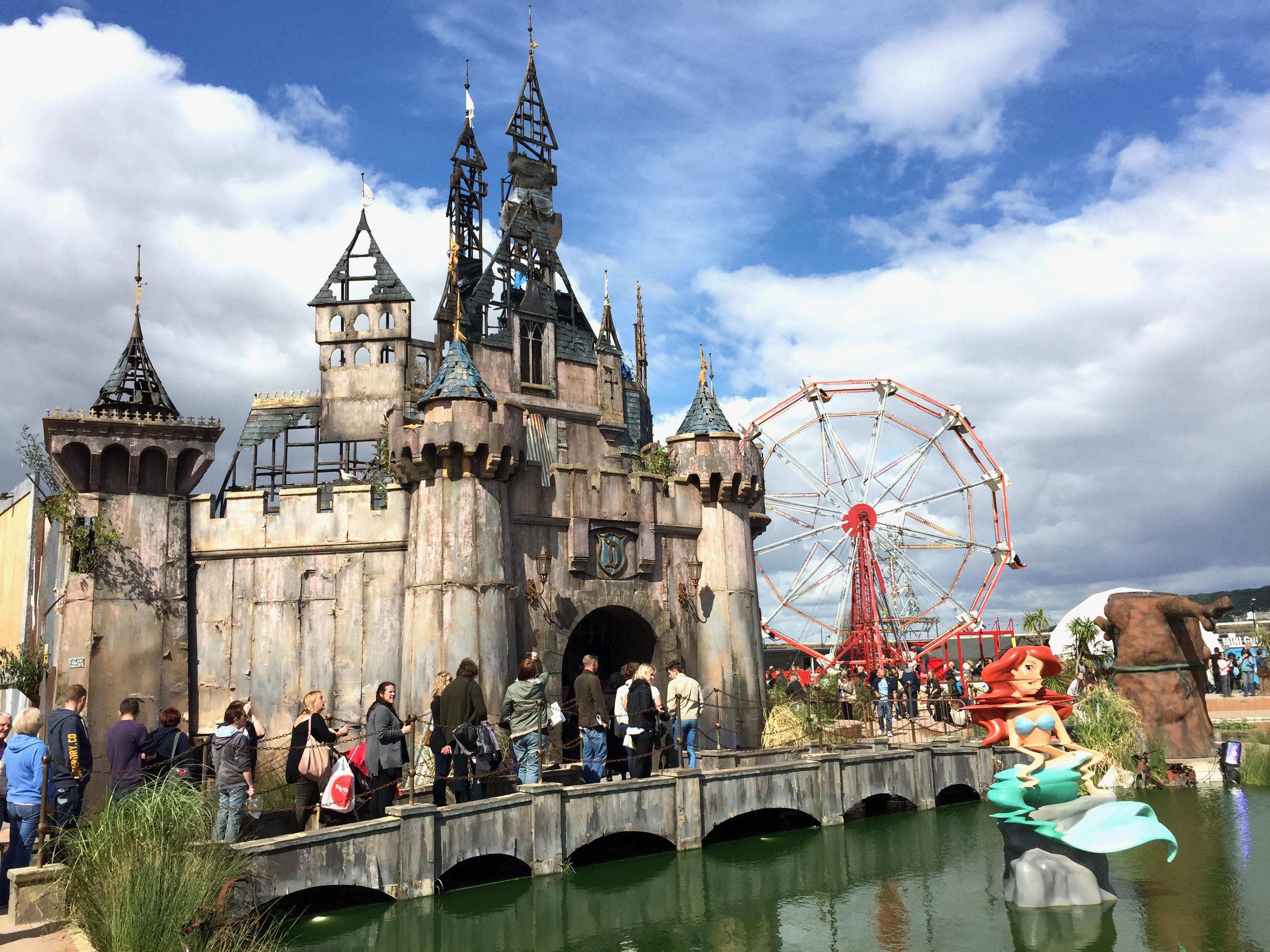 You can see why Banksy needs to control spontaneous art. Already the streets between the railway station and his attraction have been enlivened by rival street artists. Banksy. He’s so famous that Weston-super-Mare’s lucky golden ticket holders rush into the park already taking pictures, and I too am caught up in the thrill. This has been in the Daily Mail and everything, it’s got to be special.