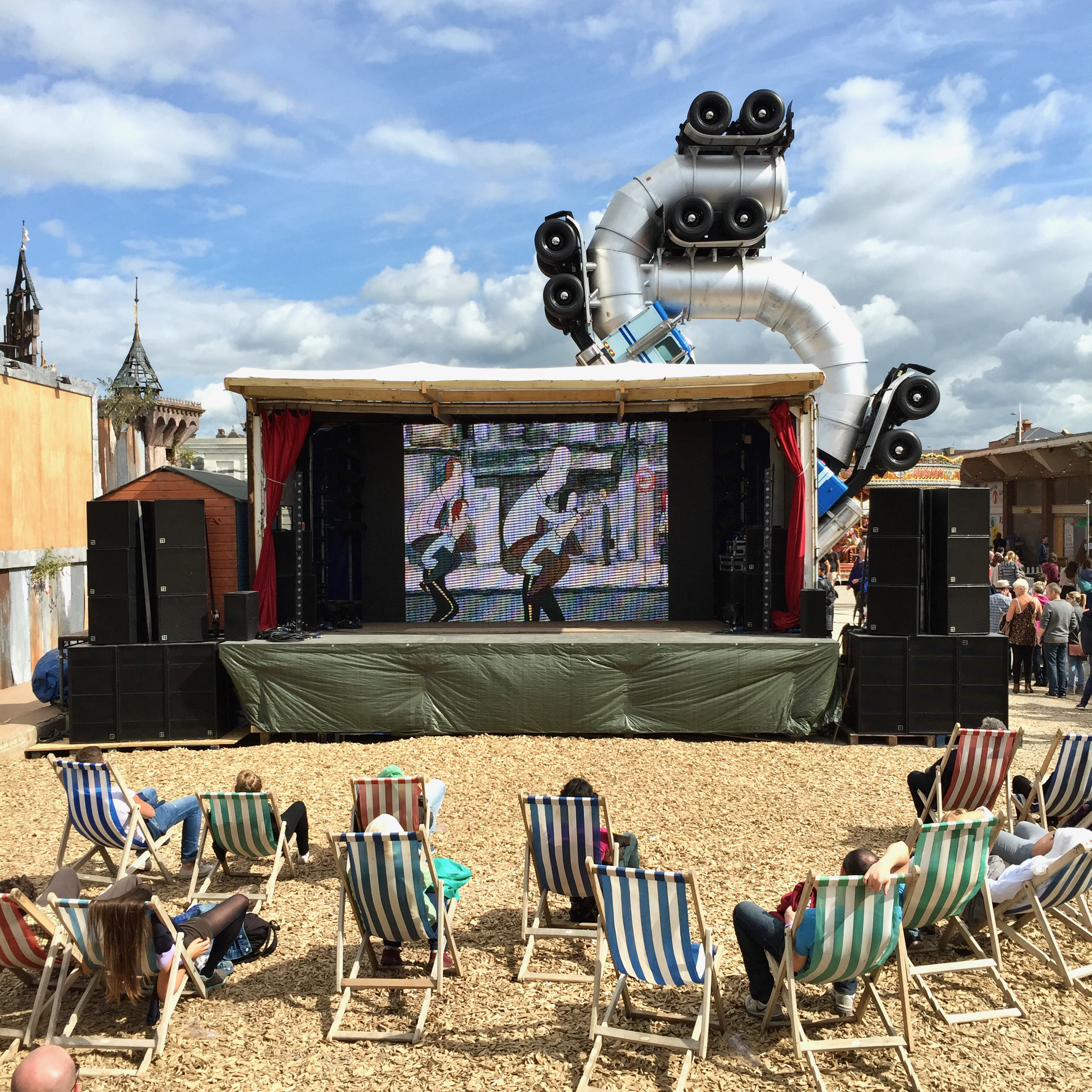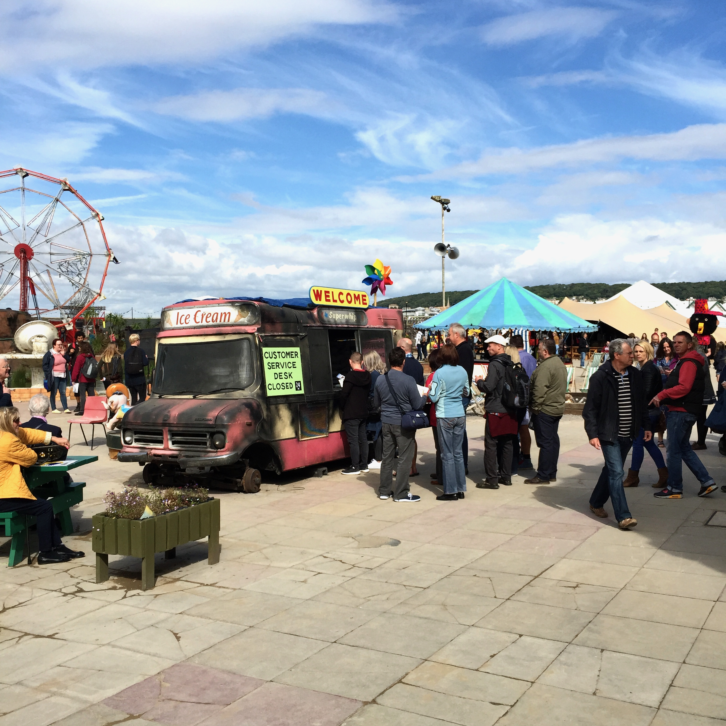 People have been waiting for hours in a queue that stretches far along the prom. A thousand free tickets have been given away to Weston-super-Mare residents for this first public day. All ages and subcultures, from punks to a man dressed entirely in union jacks, are waiting to have their bags searched.