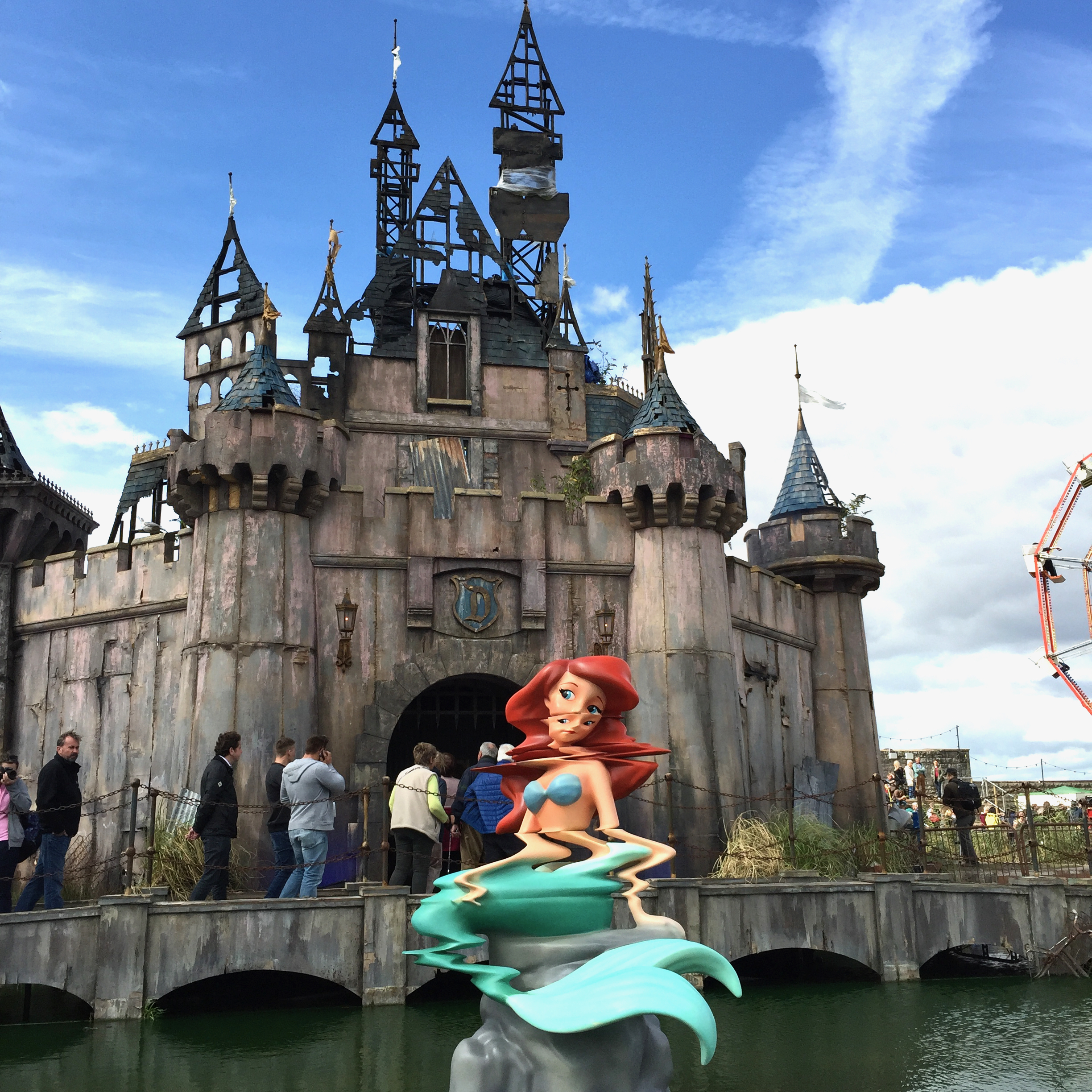 Dismaland was pop-up art exhibition, financed and organised by Banksy, staged in the seaside town of Weston-super-Mare, 30 km south of Bristol. Opening on August 21, 2015, and closing on September 27, 2015, this “bemusement park” was a dark, satirical twist on traditional theme parks like Disneyland, billed by Banksy as a “family theme park unsuitable for children.” Housed in the abandoned Tropicana lido, it combined dystopian aesthetics with sharp social commentary, targeting themes such as consumerism, celebrity culture, immigration, and law enforcement.