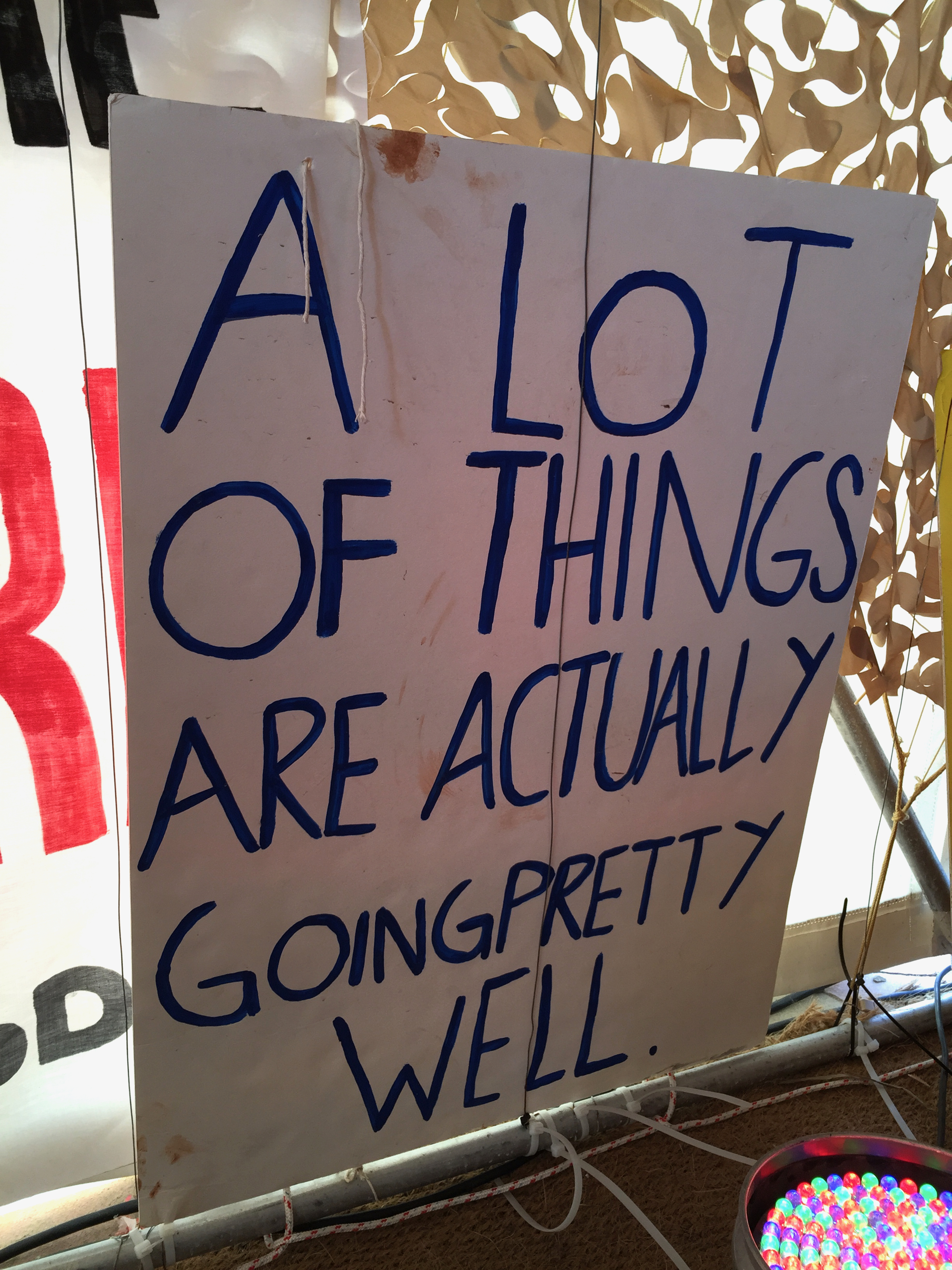 There are two layers of security as we pour in: real and fake. The fake security is one of the funniest moments of the day. Created by Californian artist Bill Barminski, it consists of cardboard X-ray machines and tables of cardboard objects supposedly taken from visitors. But this joke about modern security systems does not change the fact that before you enter Dismaland you do actually get your bag thoroughly inspected by very real security guards who asked one visitor if he had any knives or, get this, spray cans. All graffiti in Dismaland is official graffiti.