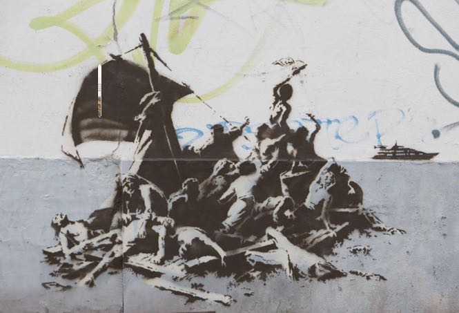 Four stencils appeared on 13 December in The Jungle, a Calais refugee camp. Since Dismaland, it’s clear that Banksy’s preferred theme is the refugee situation in Europe.