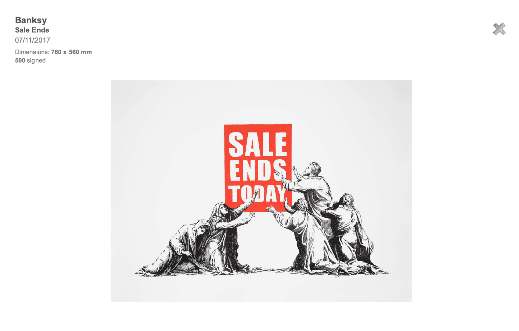 A month before, POW released a signed version of the Sales End print. The first version was sold at the Barely Legal exhibition in 2006 as part of the Barely Legal print set, six prints in unsigned editions of 100: Sale Ends, Trolleys, Festival, Grannies, Applause, and Morons.