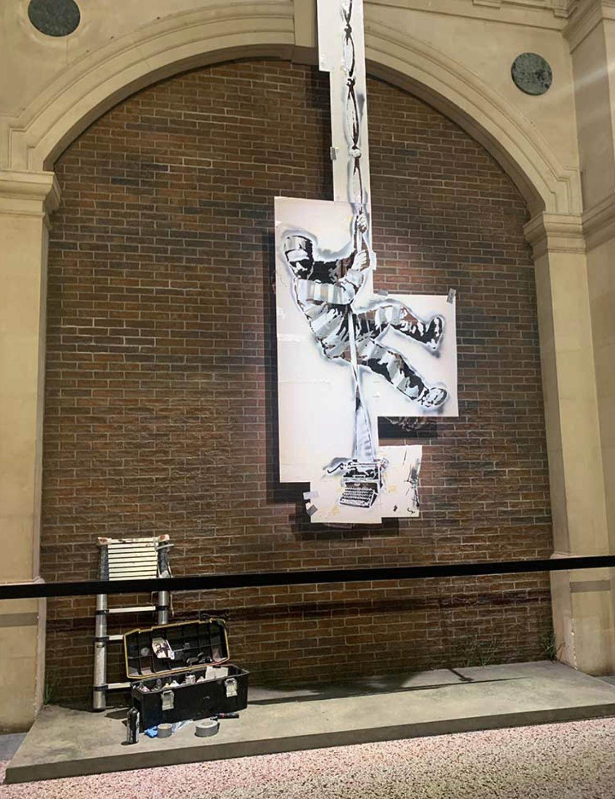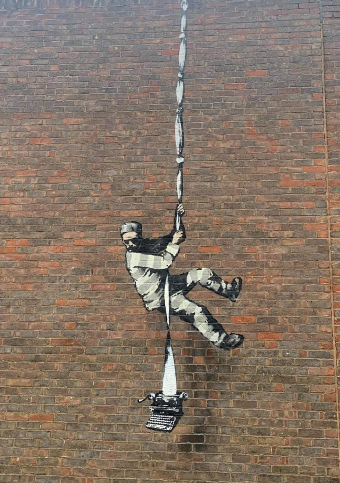 The piece depicts Oscar Wilde escaping from Reading Gaol, his typewriter knotted to the sheets. Oscar Wilde had been incarcerated in Reading GAOL prison after being convicted of gross indecency in 1895. Wilde was sentenced to two years of forced labour. The piece has not yet been confirmed by Banksy’s usual channels, but it appears to be authentic. Maybe Banksy’s next big project is a book?