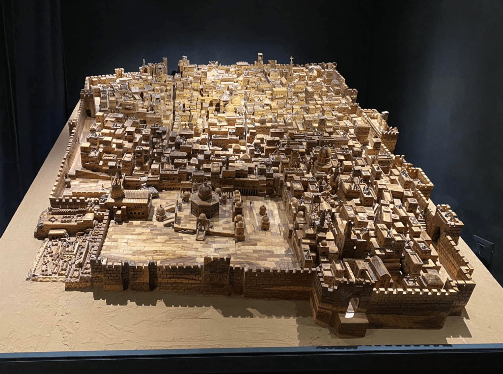 The wood-carved model of Jerusalem by Tawfiq Salsaa. Photo: @walledoff – The Walled Off Hotel on Facebook