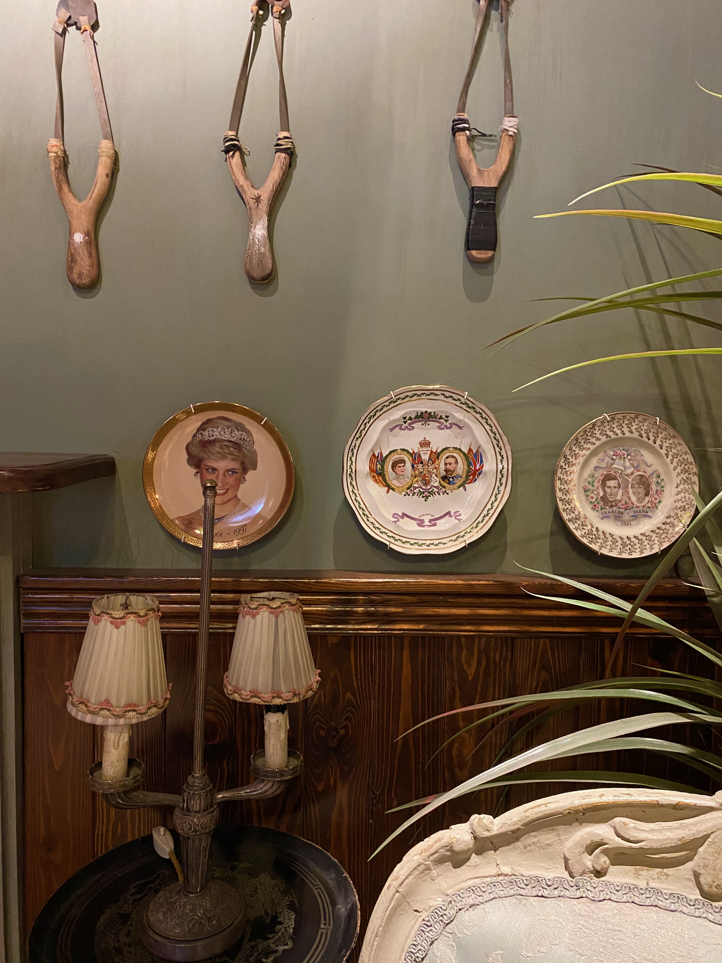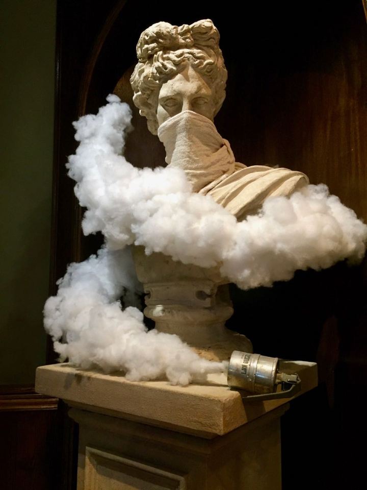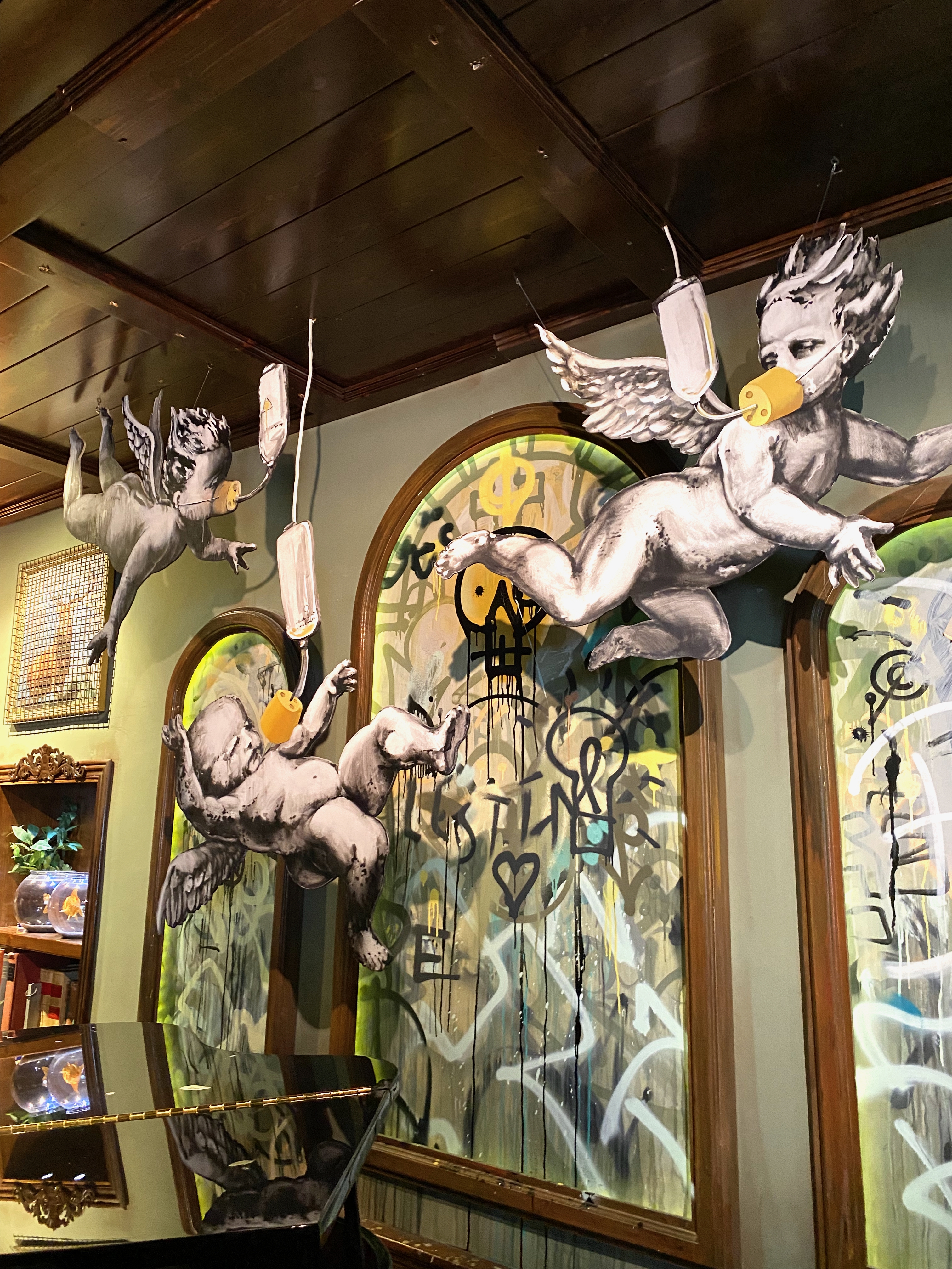The hotel, a former pottery workshop, has a dystopian colonial theme, a nod to Britain’s role in the region’s history, the reception and tea-room a disconcerting take on a gentlemen’s club where a self-playing piano provides an eerie soundtrack. The fire flickering in the grate glows under a pile of concrete rubble, like a blaze at a bomb site, a classical bust in a niche is wreathed in clouds of gas snaking out of a tear gas canister and, in traditional seascapes, the beaches are littered with life-jackets discarded by refugees.