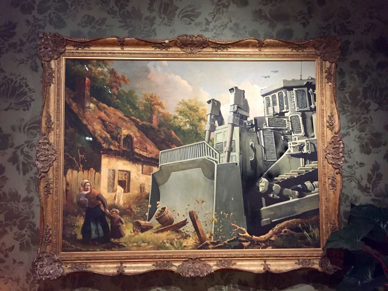 The Walled Off Hotel is the latest big exhibition by Banksy. The unique boutique hotel is a piece of art in itself and effectively mixes art, politics, and tourism. On the ground floor are approximately 15 new Banksy studio pieces and a museum commemorating “a hundred years since the British took control of Palestine and helped kick start a Century of confusion and conflict”.