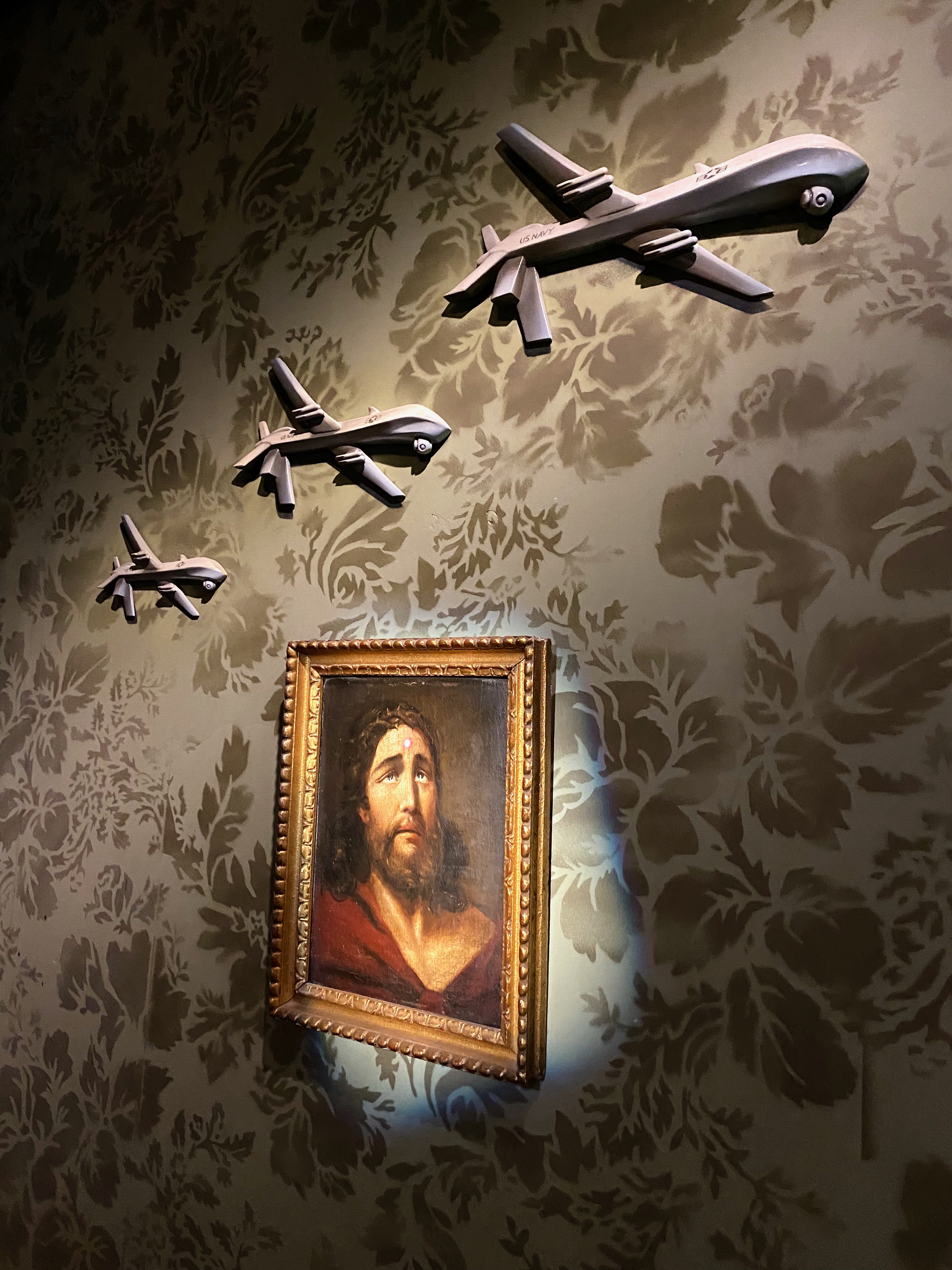 The hotel has ten rooms, including a presidential suite with a bullet-riddled water tank feeding a hot tub, budget bunk-bed rooms sourced from old military barracks, and custom-designed spaces by Banksy and other artists like Sami Musa and Dominique Petrin. The decorative style is colonial, nodding to Britain’s historical role in the region, particularly the 1917 Balfour Declaration, which marked the beginning of British control over Palestine. Everywhere in the hotel, you will find Banksy’s provocative artwork—such as an Israeli soldier and a Palestinian protester engaged in a pillow fight, cherubs wearing gas masks or Jesus Christ being bombed by drones. .