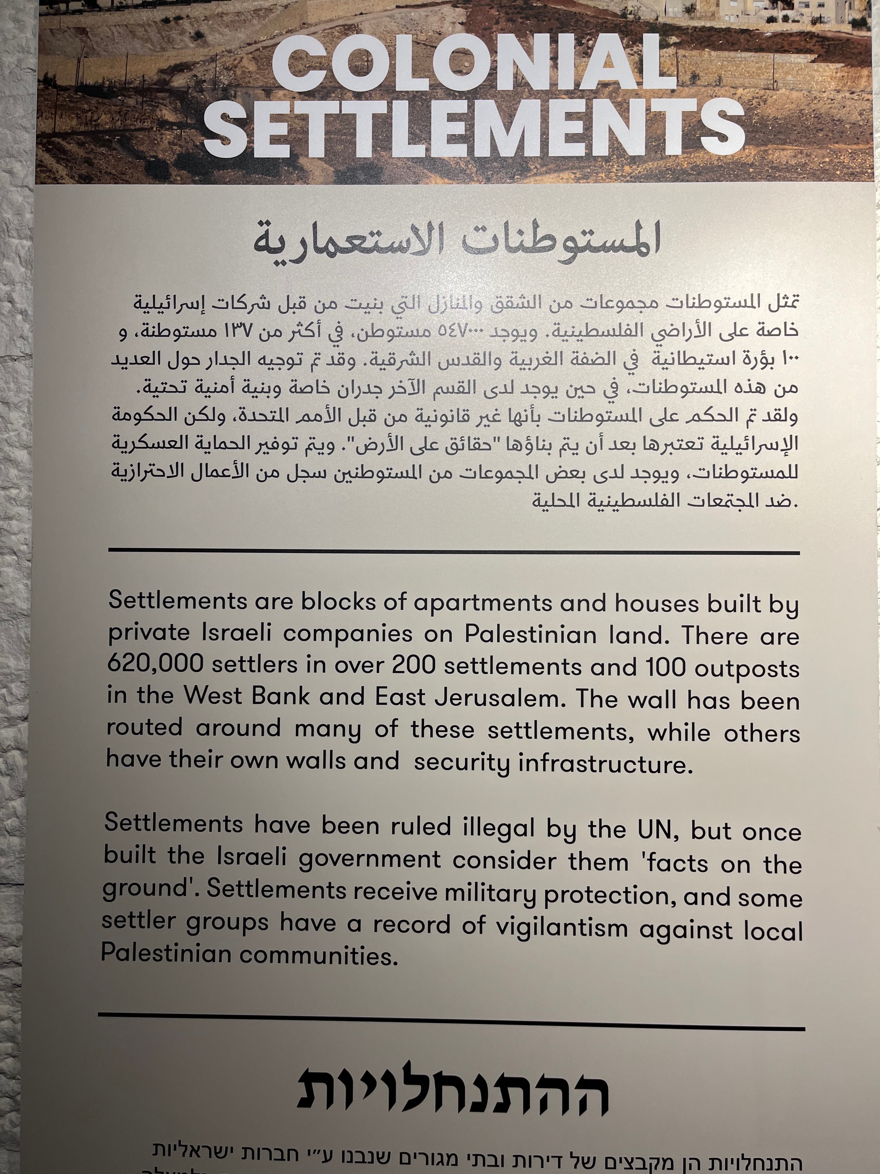 The museum on the ground floor is dedicated to the history of the segregation wall. Dr Gavin Grindon from Essex University collaborated in its design. It gives you a very clear picture of what has happened since the occupation started.