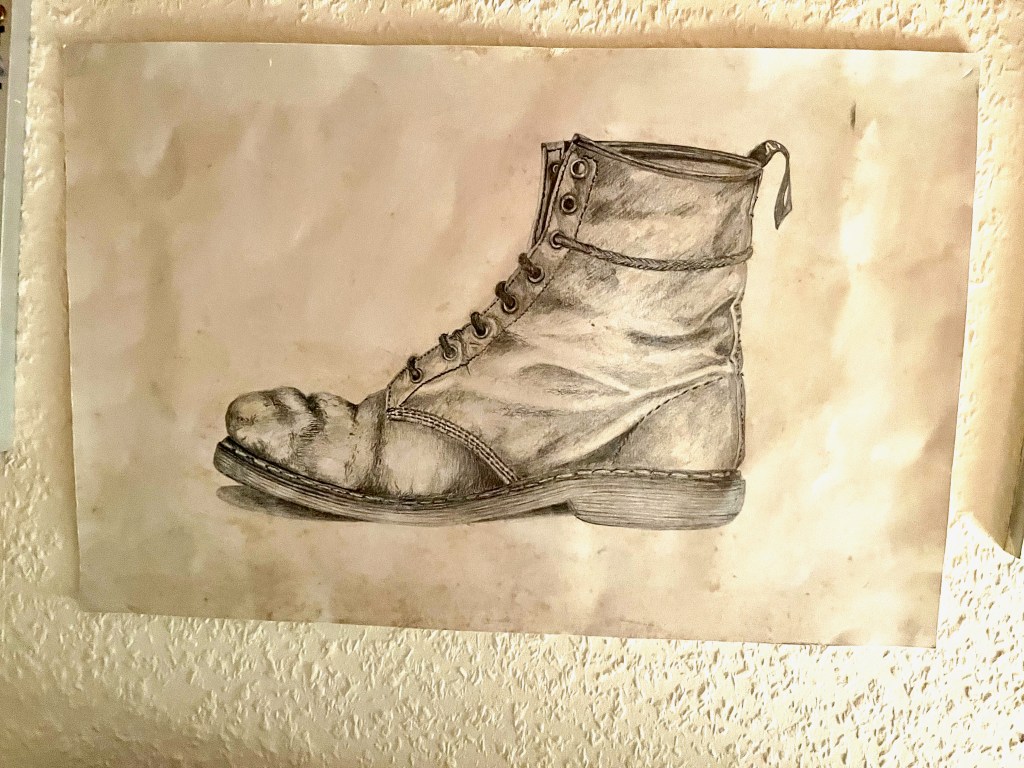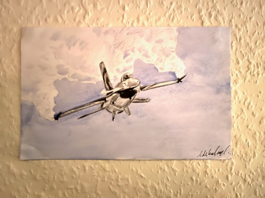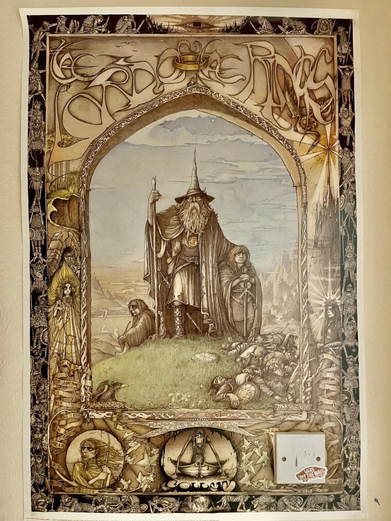Banksy’s interest in helicopters started earlyEarly drawing, signed A.M.W…Spitfire, signed A.M.WLord of the Rings poster by Jimmy CautyMagritte posterThere are lots of Christian references in Banksy’s imagery. Maybe it started with young Banksy attending Bible-school on Sundays?