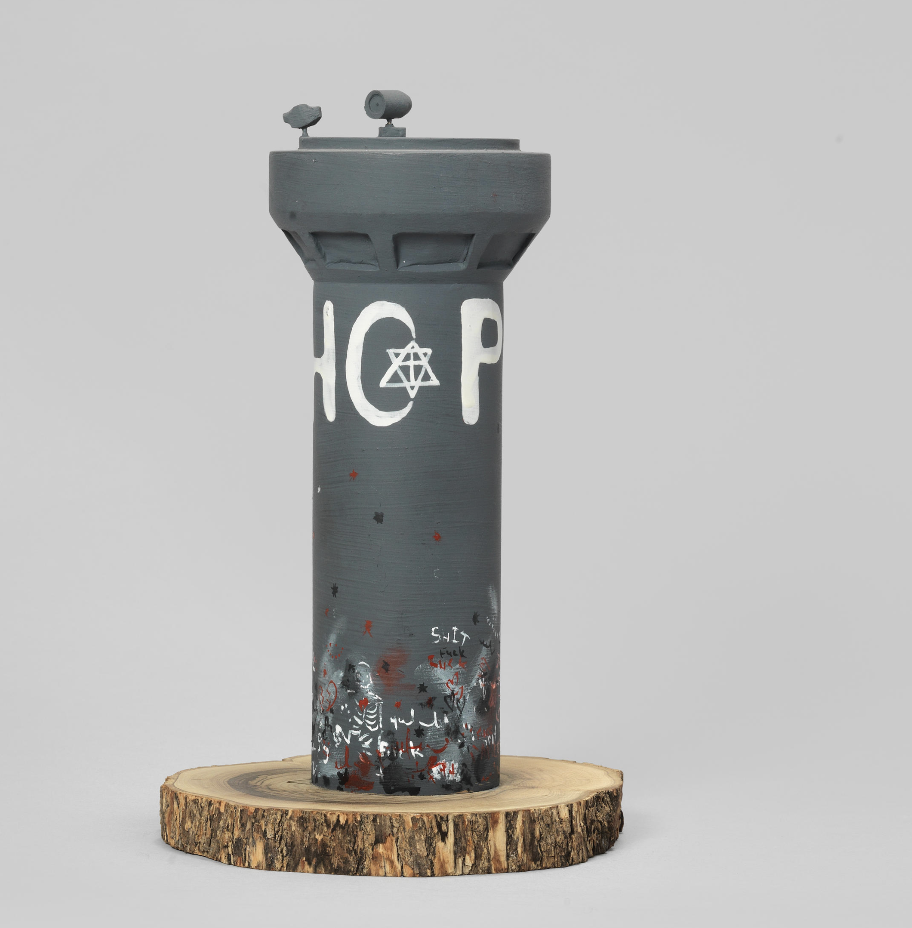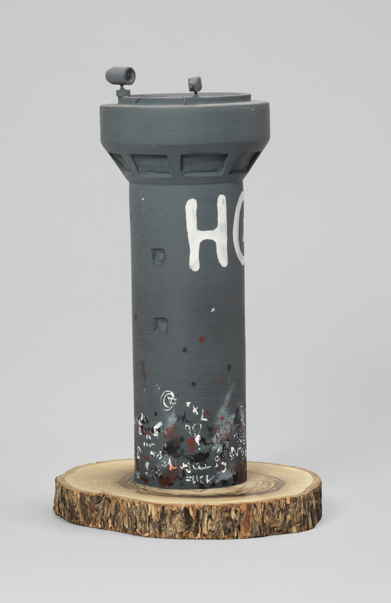 If Pop artists responded to the shiny new consumer culture that emerged after World War II, graffiti artists responded to its decay, reflecting disillusionment and broken promises. This underbelly of consumerism also surfaces in several large, immersive installations. “Street Market” by Todd James, Barry McGee and Stephen Powers is a facsimile of a clutch of narrow city streets lined with decaying, fetid buildings and bedecked with cheap electric signage. The buildings are filled with what look like miniature art studios and makeshift living spaces that can be glimpsed only through the windows; they’re like little dens of creativity amid the ruins of consumer society.