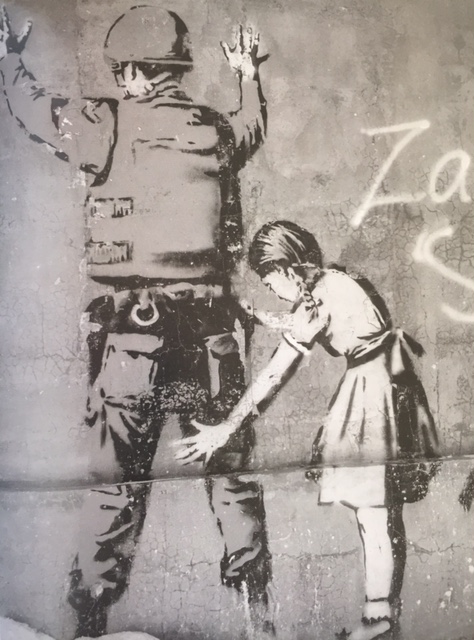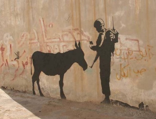 The Museum of Contemporary Art Los Angeles (MOCA), held a collective street art exhibition in April 2011. Banksy participated with versions of old work and some new stuff. Forgive us our trespassing—the graffiti boy praying—was a collaboration between Banksy and a local art school.