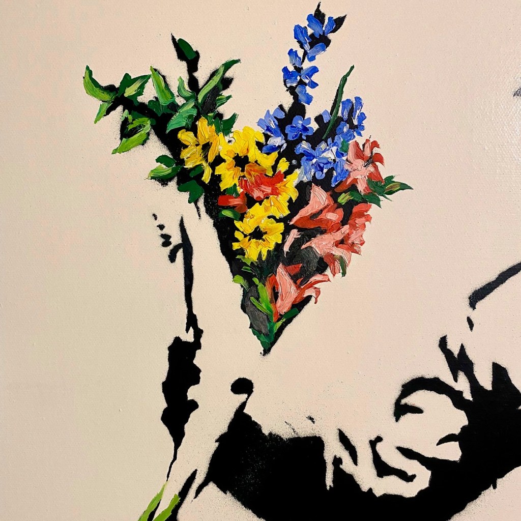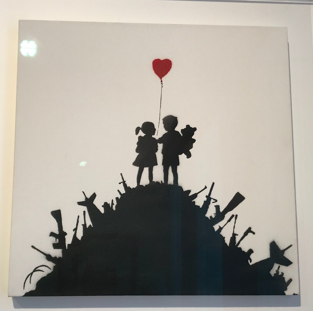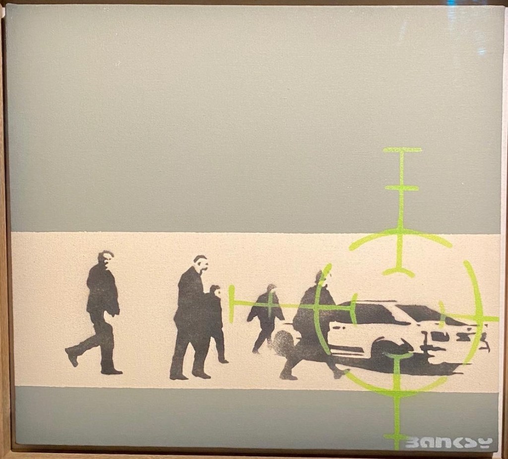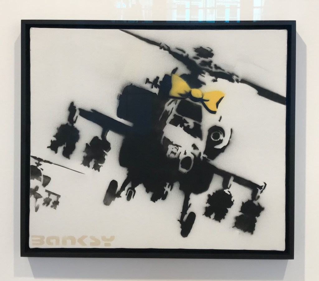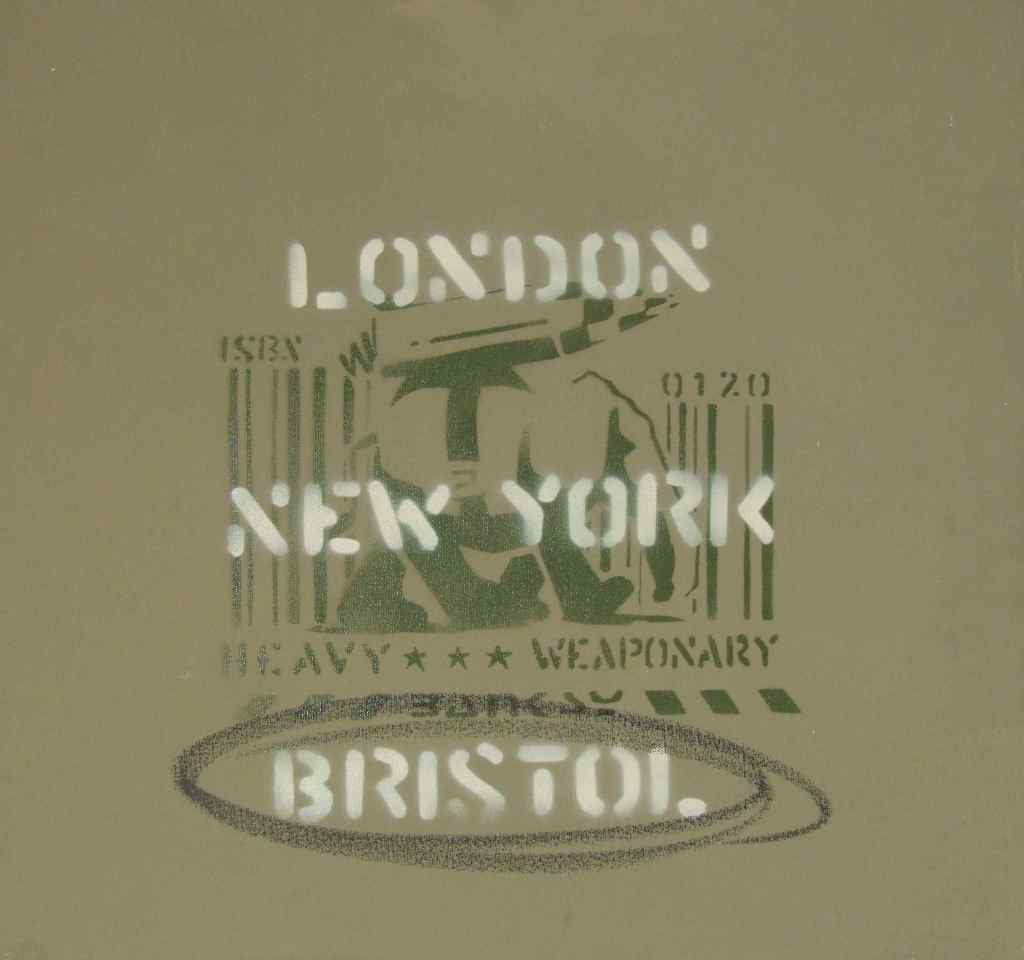 There are approximately 40 different motives made as multiple canvases; among them are some versions of Love is in the Air or Girl with Balloon. Another typical multiple is the Heavy Weaponry canvas from an edition of 25 identically stencilled armed elephants on a grey-green background. The standard dimension of an editioned canvas is 40 x 40 cm. Some have hand-finished details; these are labelled hand-painted multiple, or HPM for short.