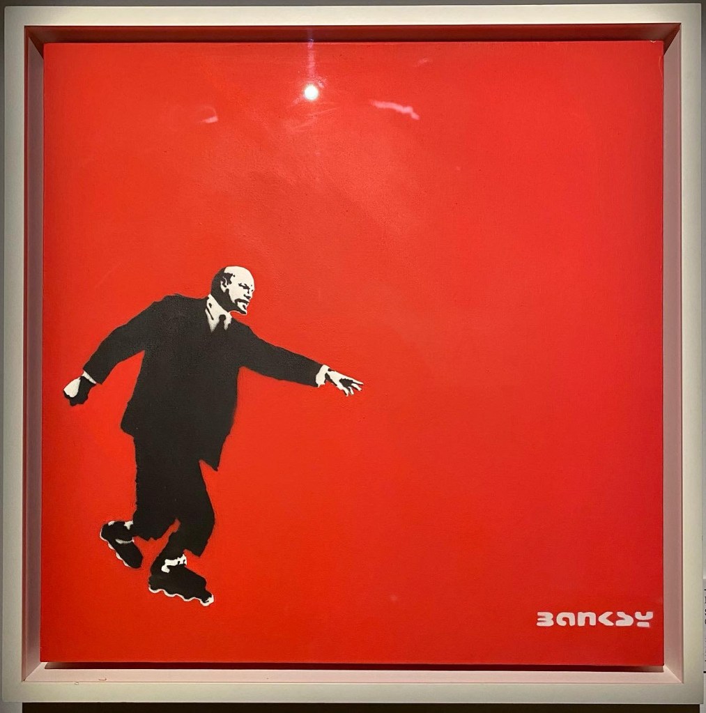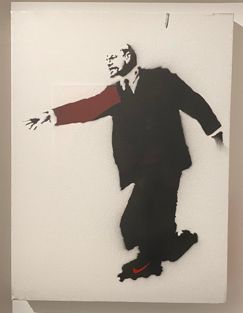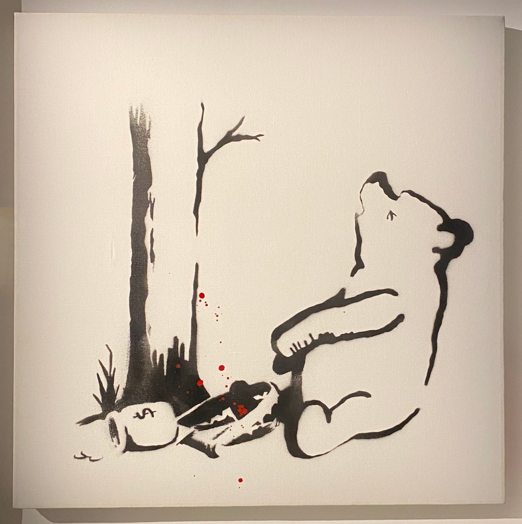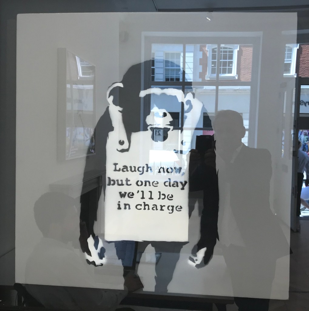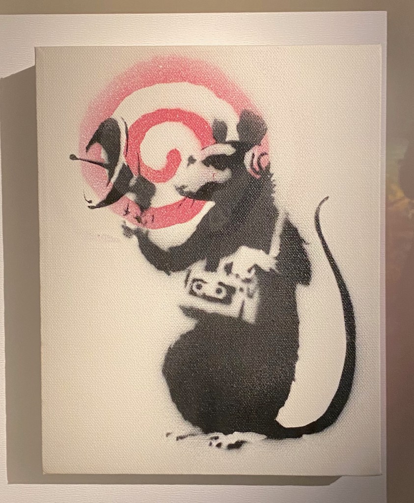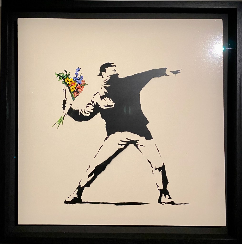 There are approximately 40 different motives made as multiple canvases; among them are some versions of Love is in the Air or Girl with Balloon. Another typical multiple is the Heavy Weaponry canvas from an edition of 25 identically stencilled armed elephants on a grey-green background. The standard dimension of an editioned canvas is 40 x 40 cm. Some have hand-finished details; these are labelled hand-painted multiple, or HPM for short.